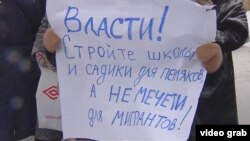 "У меня тут дочь и внучка живут. Я не говорю, что они все бандиты. Но может кто-то специально приехать и проводить диверсии, – возмущается еще одна участница митинга против мечети. – Надо ведь думать о безопасности наших детей!"