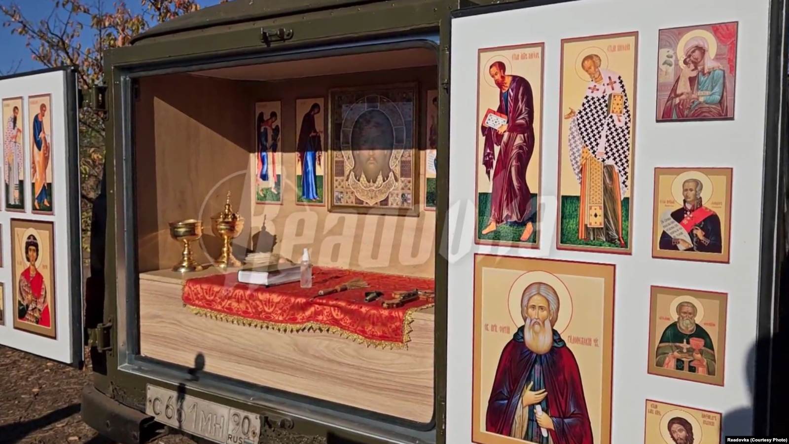 Передвижной храм в автомобиле УАЗ для военных священников, которые проводят службу на линии фронта. Источник: Readovka