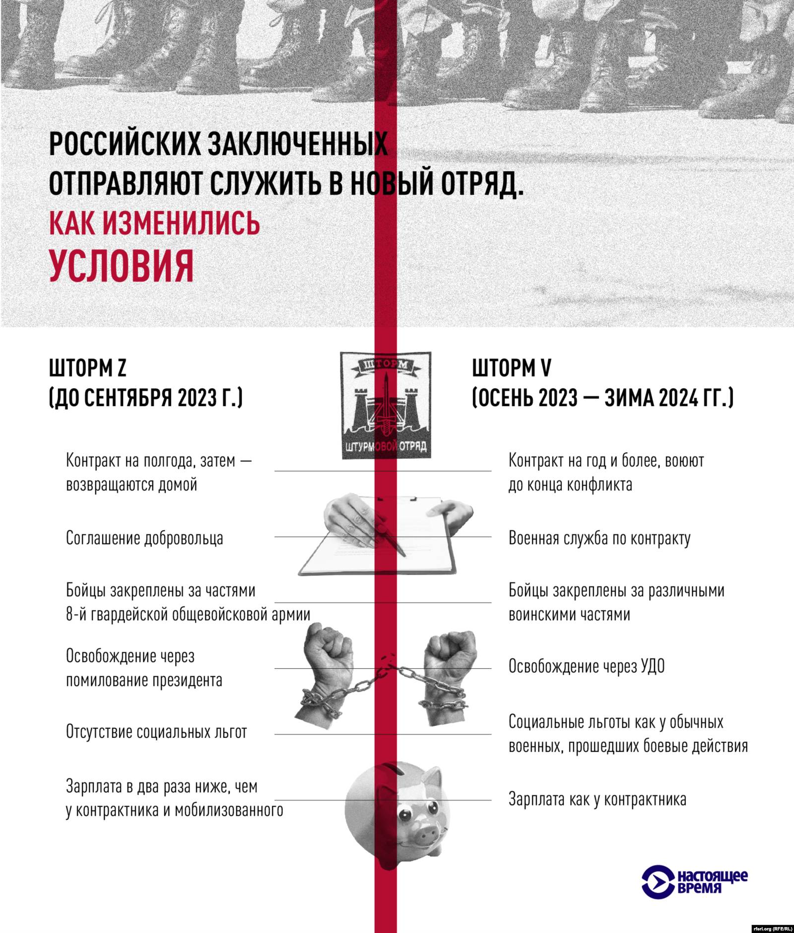 Бойцы "Шторм Z" получают помилование от Владимира Путина – и таким образом, пройдя через боевые действия, уже де-юре освобождаются из колонии. У них меньше прав, чем у контрактников или мобилизованных: зарплаты ниже, выплаты за ранение меньше, страховых выплат и доступа к социальным льготам вовсе нет (более того, "зетовцы" даже не могут оформить военную инвалидность). Воевать они уходили либо по полугодовым "добровольческим" контрактам, либо заключив "соглашение" с военным ведомством на тот же срок, после чего выжившие заключенные возвращались домой. Часть подписавших такие контракты командование "продавало" в "ЧВК Редут". Сейчас набор в отряды "Шторм Z" фактически прекращен – новых бойцов из колоний набирают в отряды "Шторм V".