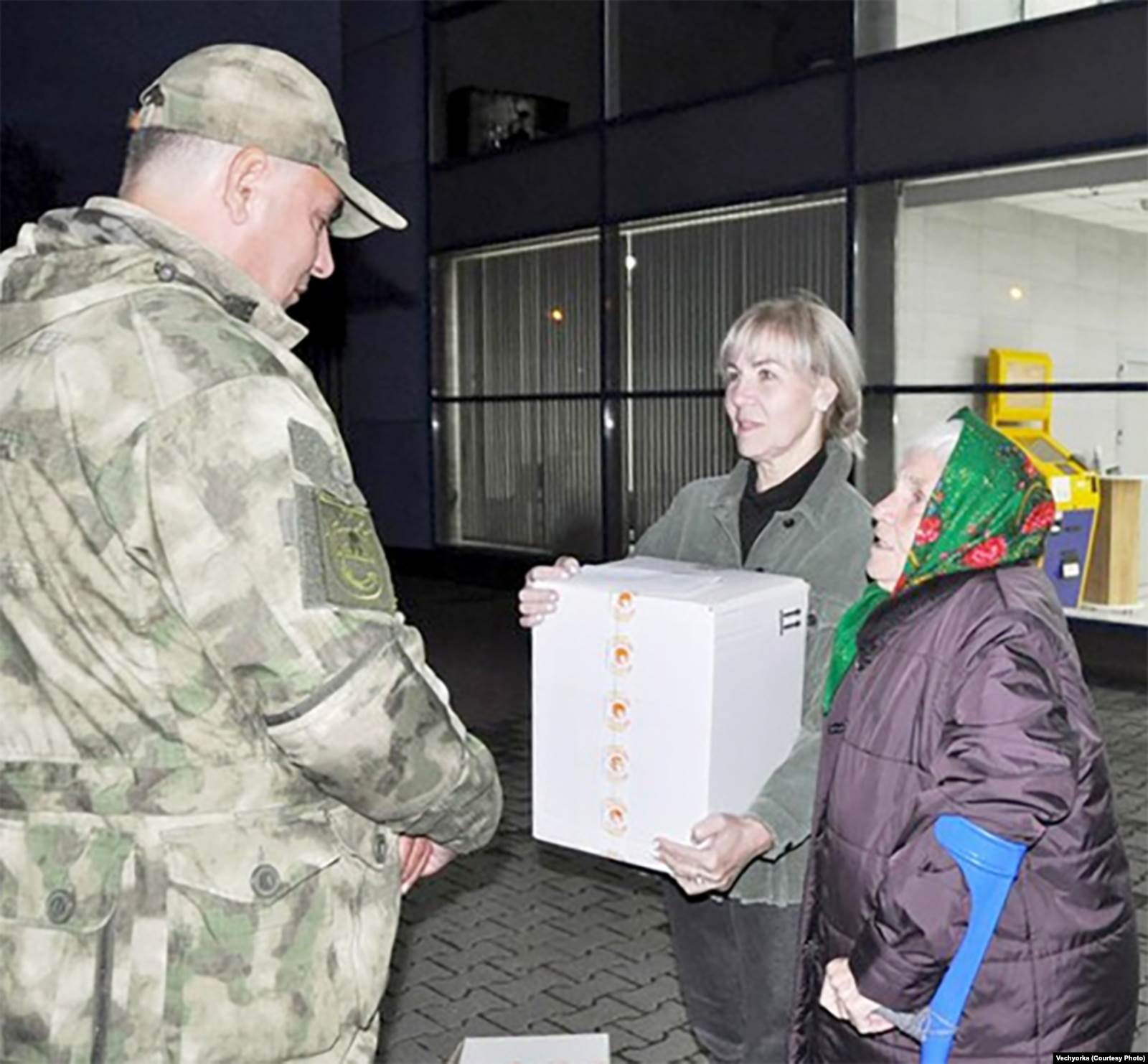 Пенсионерка передает "гладиаторам" партию носков. Источник: "Вечерка"