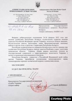 Глава украинской пограничной службы направил официальное письмо председателю пограничного комитета Беларуси. Он отметил, что российское вторжение, в ходе которого российские войска наносят ракетно-бомбовые удары по гражданским объектам в Украине, осуществляется при полном содействии республики Беларусь.